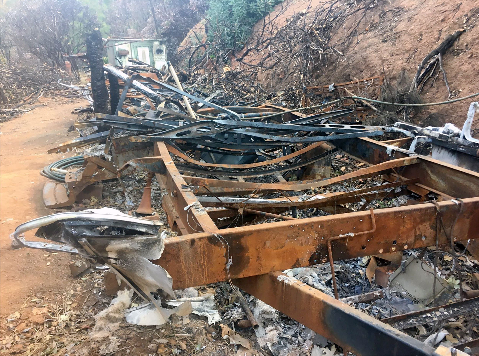 The damage to the property was extensive. The property was seated on a steep hill with dense vegetation that had burned at very high temperatures. The RV itself was completely incinerated, leaving just the scorched frame. In addition, the frame was stuck behind two burnt shipping containers with no other access points for debris removal. Over a year after the fire event all the ashen debris remained in place.