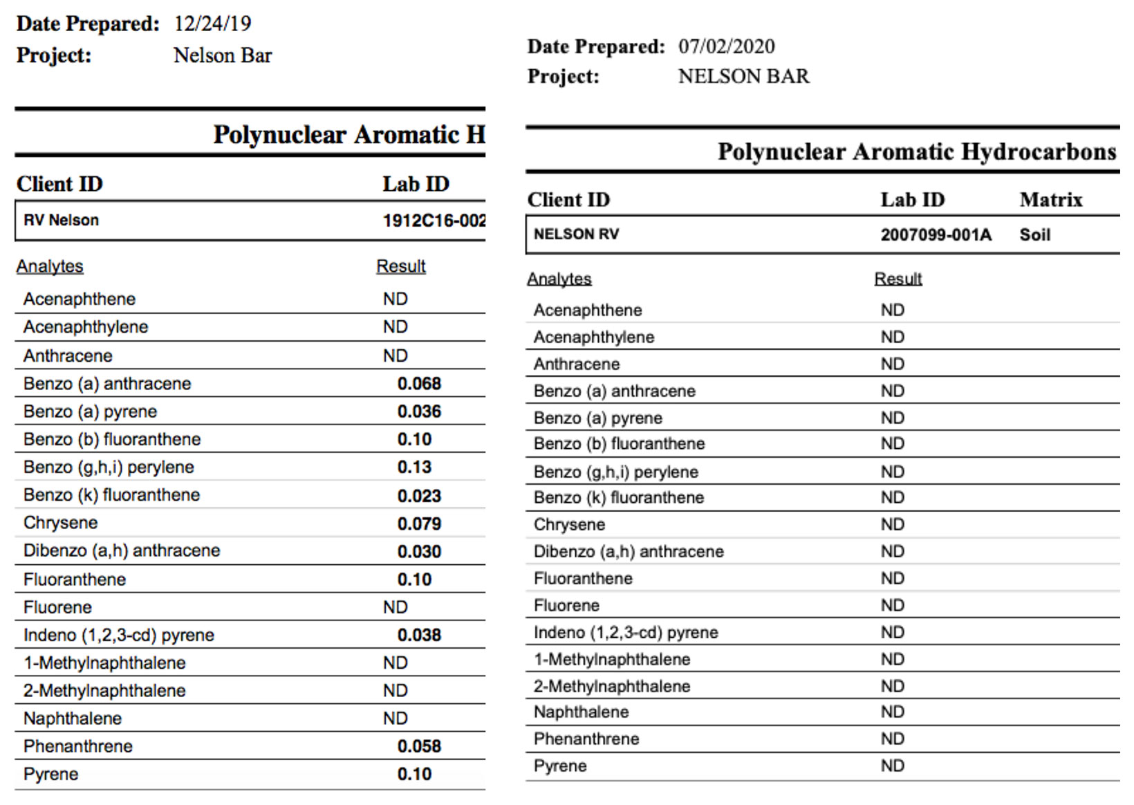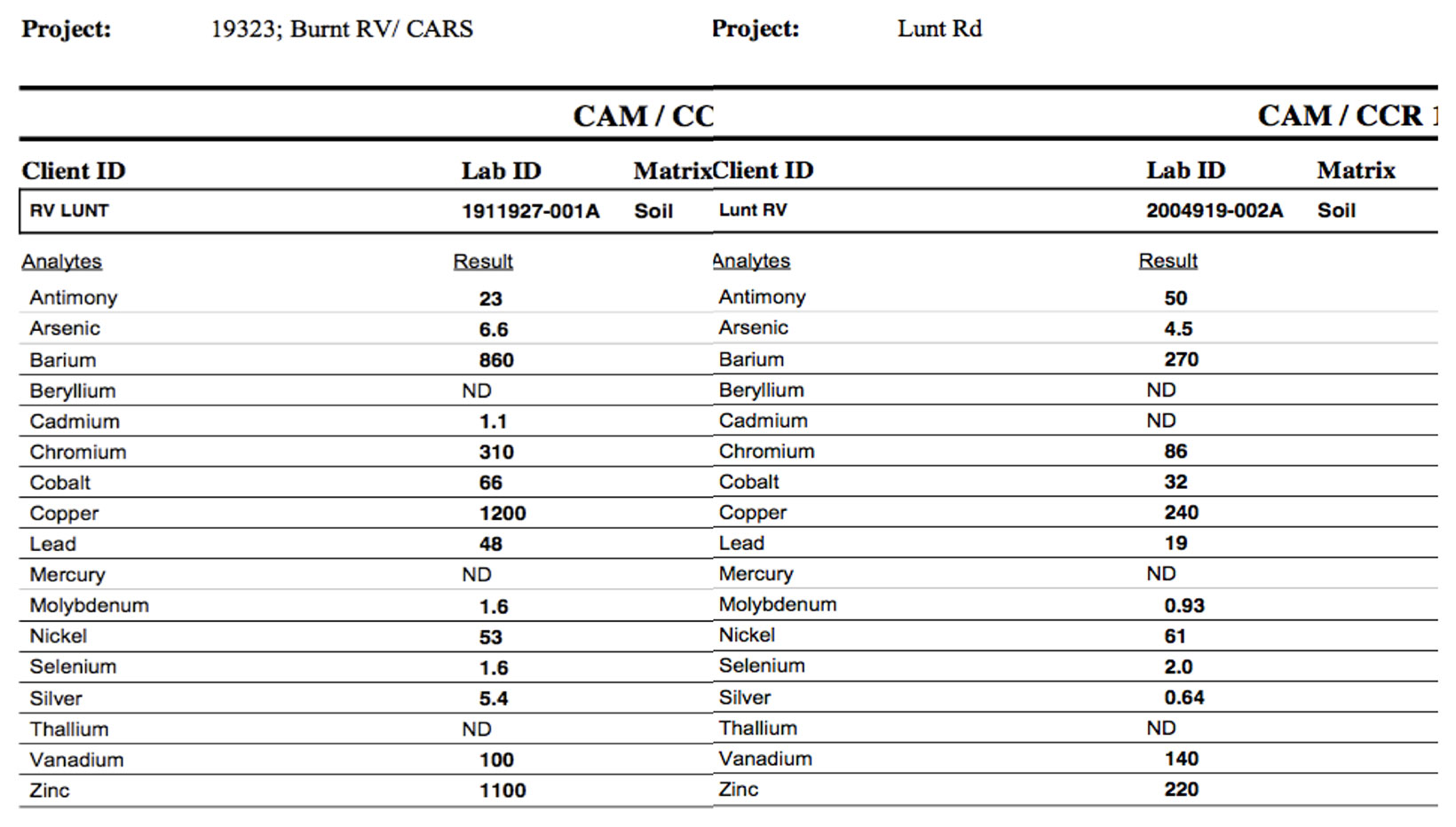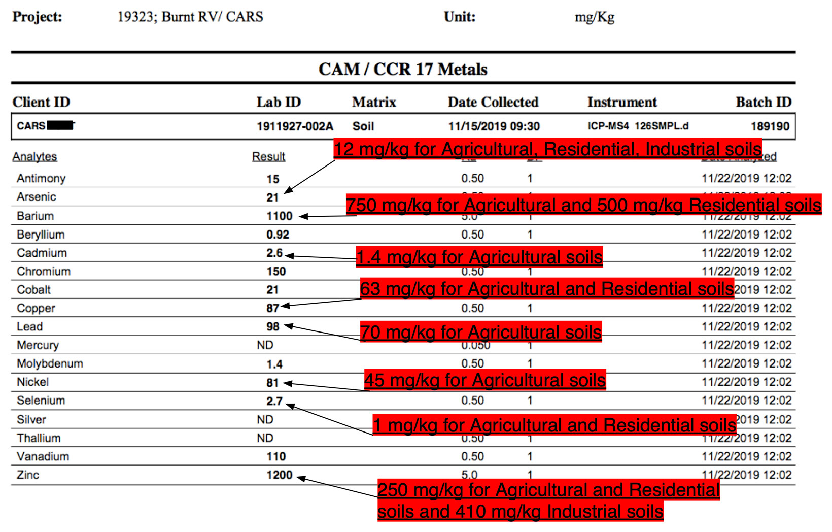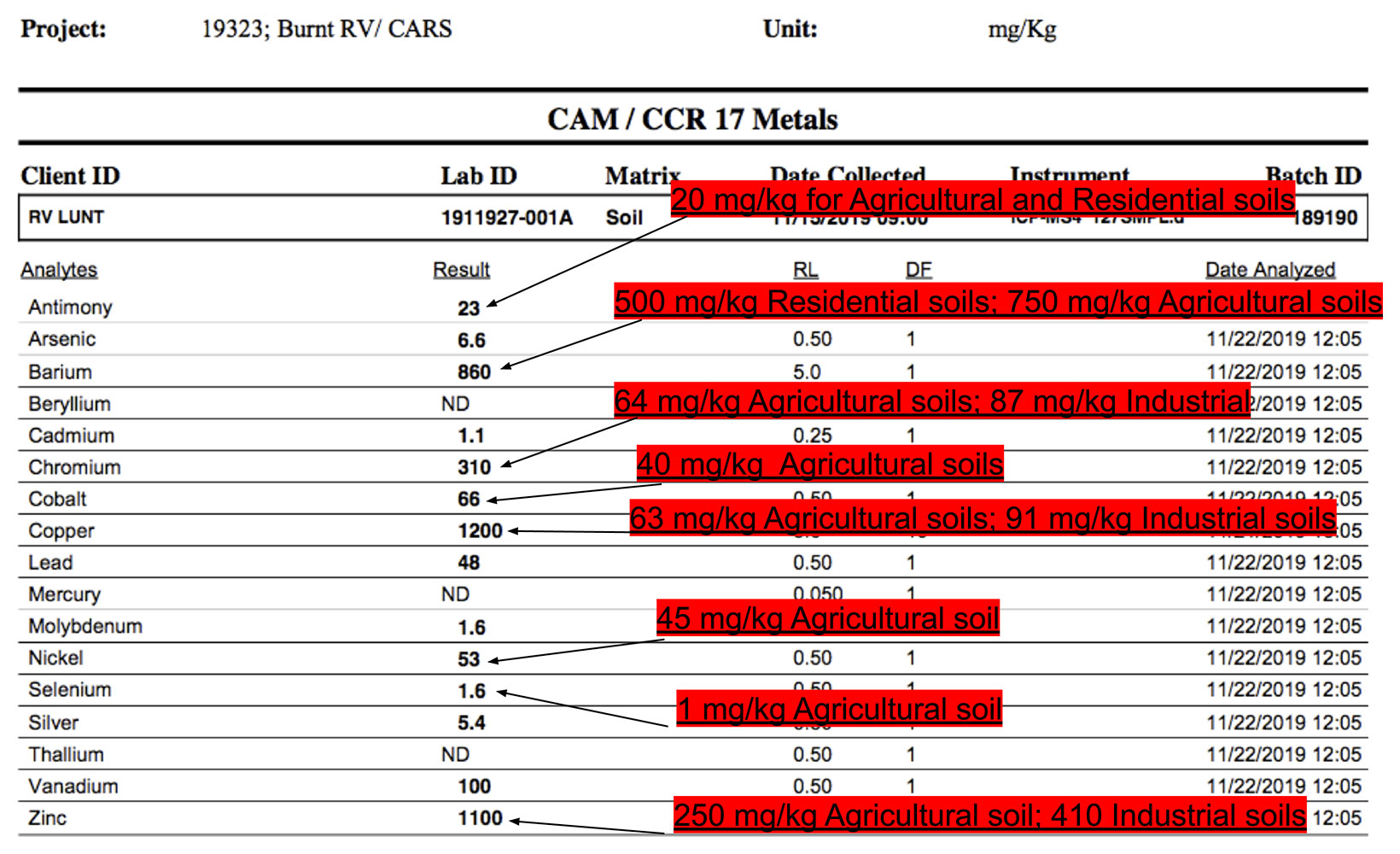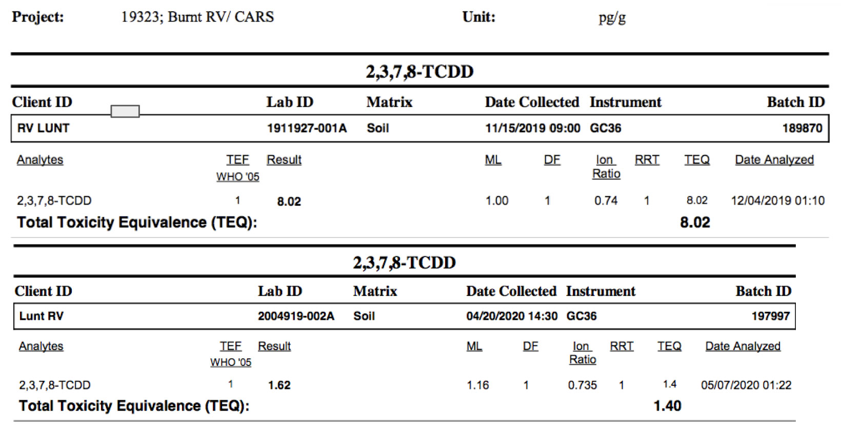 A composite sampling of 5 different sites in the ash footprint of the RV were collected and tested for heavy metals, benzenes, dioxins, and PAHs. Heavy metals and dioxins were detected.