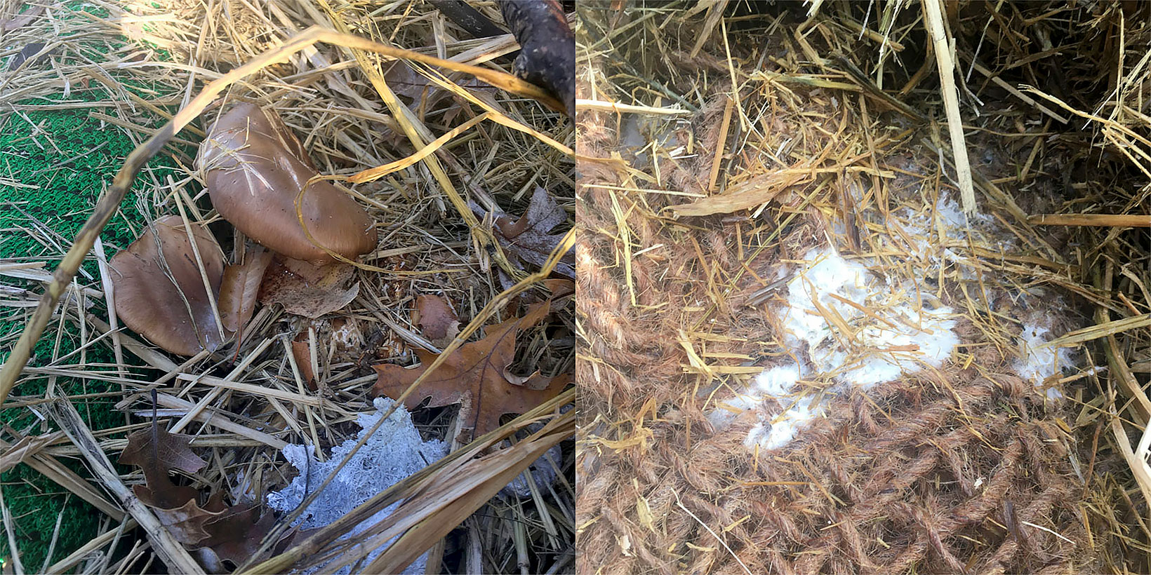 Figure 3. Mycelial and mushroom growth in ashen debris of RV frame (left) and fungi growing through Jute Landscape Fabric.