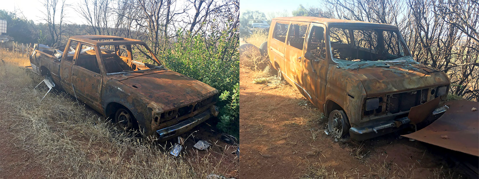 On the same site as the RV described above, there were cars were on a property that were ineligible for CalOES debris removal. In this circumstance there were several burned vehicles, in a remote section of forest, up a steep, rutted dirt road. As it is unlikely that a wrecking truck would be able to traverse or turn around on this narrow road, these vehicles would have to be dismantled and removed as scrap.
