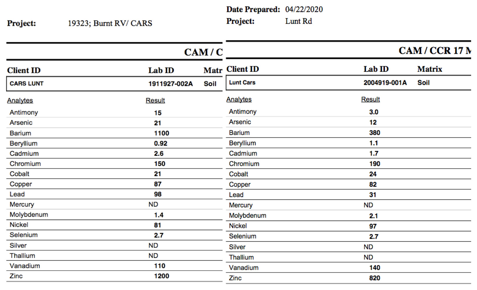 Figure 7. Before (left) and after (right) analysis of burned vehicle composite samples. While there are some promising results with reduction of antimony (5X reduction), barium (2X reduction), and perhaps most importantly lead (3X reduction), there is also several slight increases in toxin content of soils for several elements. Most noteworthy is chromium, which may be the result of further flaking off of chrome trim from the vehicles.