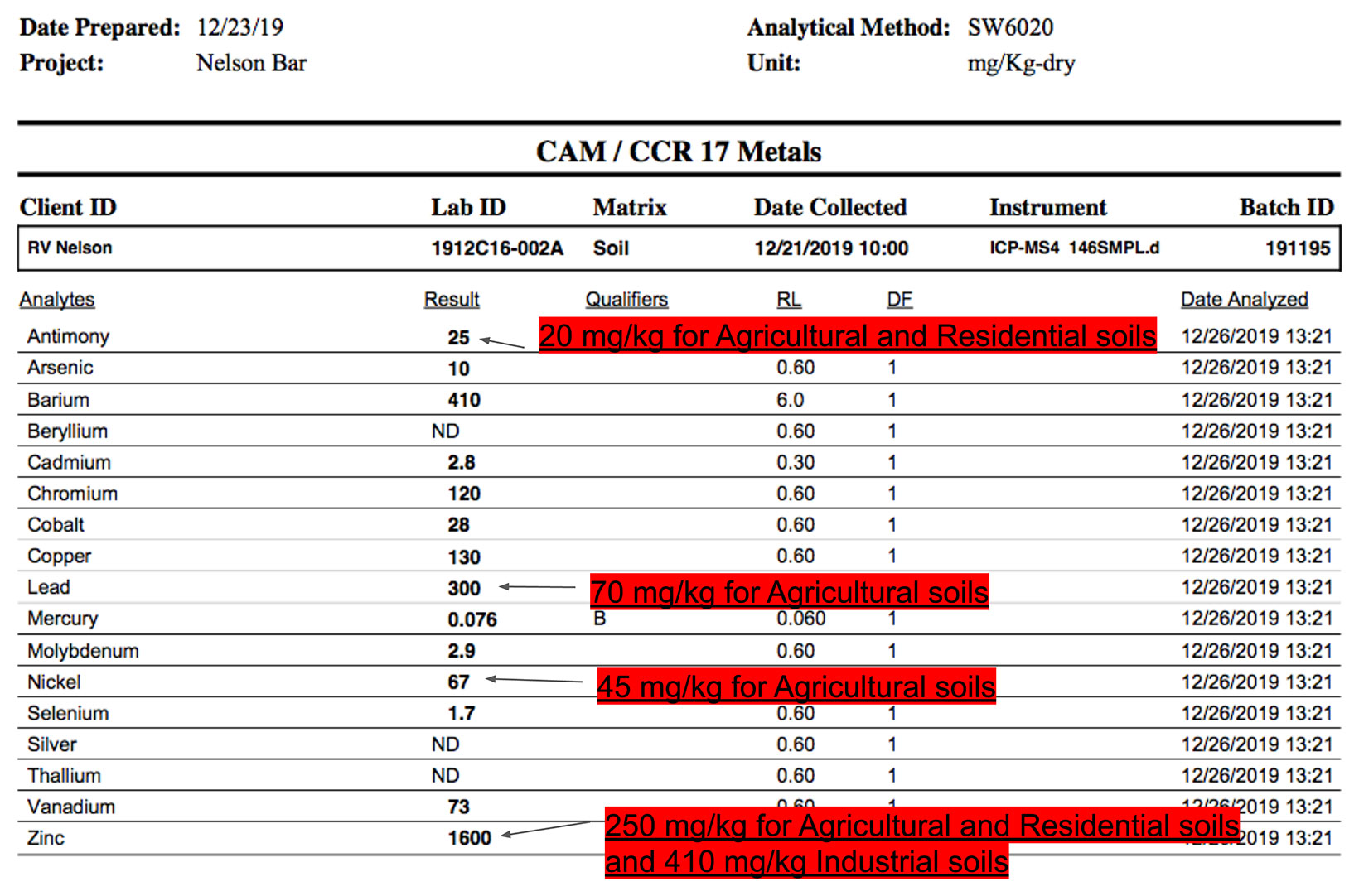 Figure 6. Heavy metal composite sample from several of the burned vehicles reported in mg/kg dry weight. Red highlights have the threshold for safe and allowable levels based on Canadian Council of Ministers of the Environment standards. Areas of concern include arsenic, barium, cadmium, chromium, nickel, lead, and zinc.
