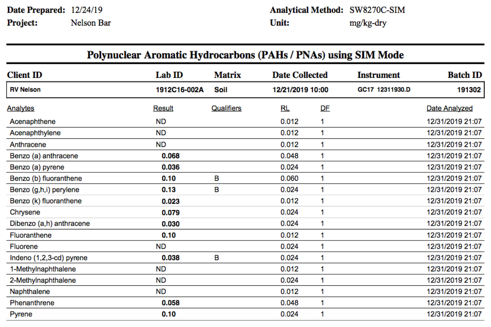 Figure 9. Polycyclic Aromatic Hydrocarbons reported in mg/kg. Both EPA and the Canadian CME standards for PAH toxicity are variable. Depending on exposure rate and land use safety standards change, and no solid number for what is safe and allowable was available.That said, the cumulative rates of PAH contamination seen here would be of some concern.