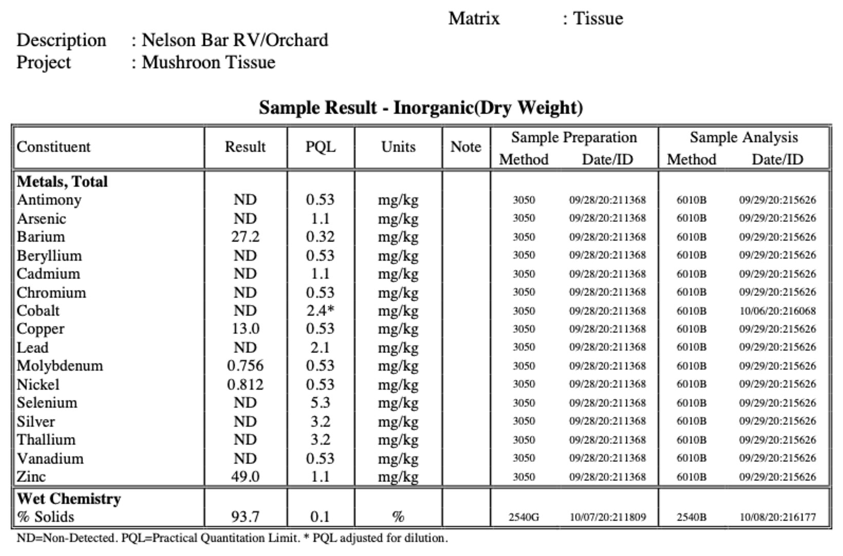 Figure 12. Tissues sample from mushrooms taken from the ash footprint of an RV. This table shows levels of heavy metals translocated into the fruit body reported in mg/kg on a dry weight basis. The copper and zinc levels are comparable to that in commercially produced mushrooms. Normal/Safe barium for mushrooms is unknown to this author.