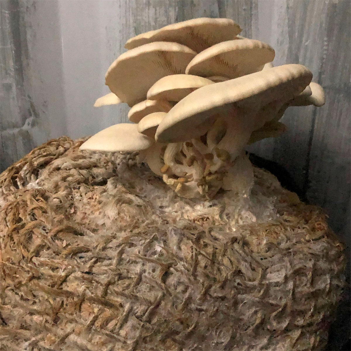 Figure 13. Roll of Jute Landscape Fabric fully colonized by Oyster mushroom mycelium, with mushroom sprouting from it.